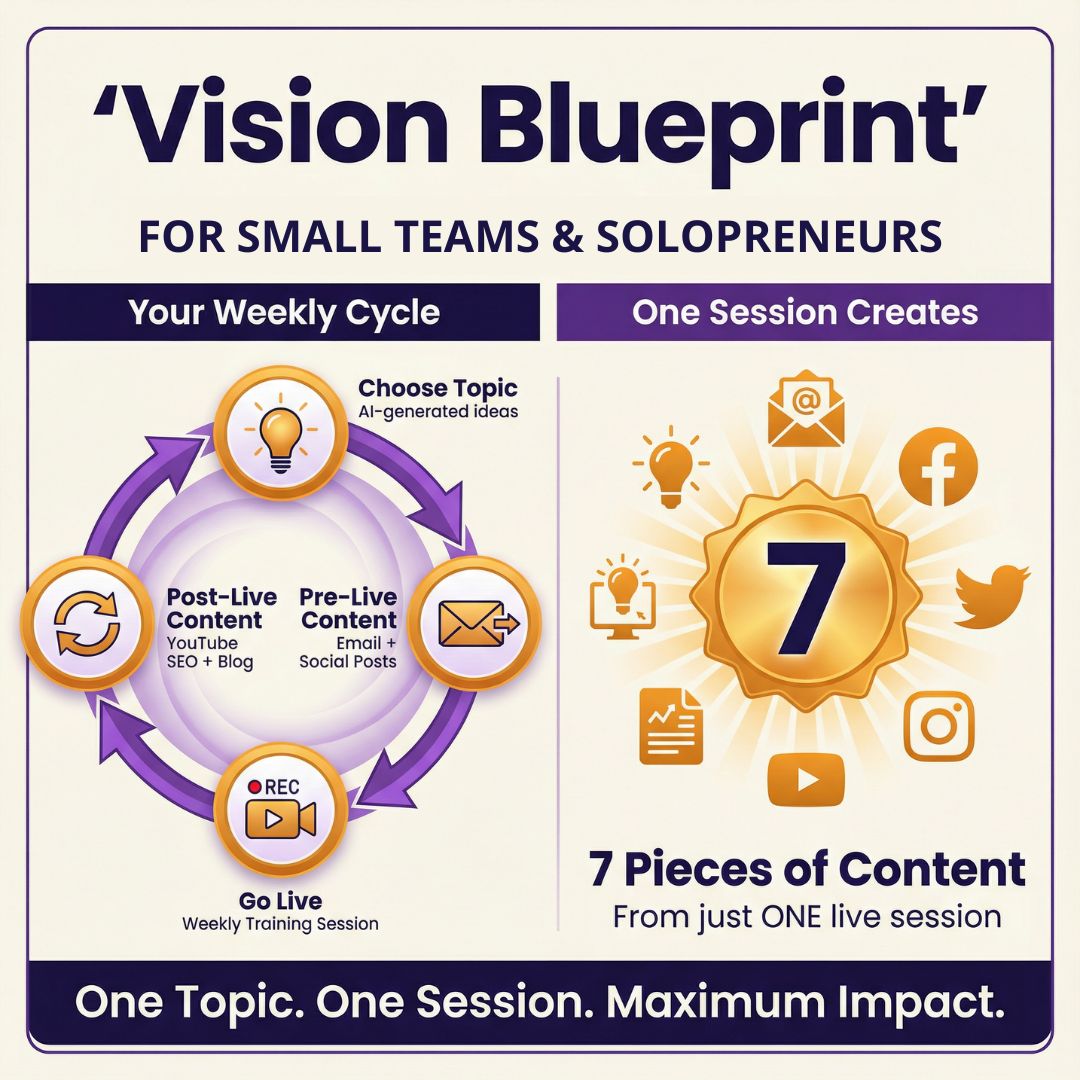 Transform your weekly live session into 7 pieces of marketing content automatically. The Vision Blueprint gives you the freedom you've been searching for.